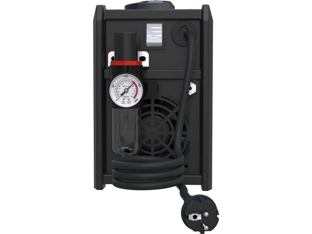 Konstrukce: plášť z ocelového plechu, redukční ventil s filtrem, manometr, ventilátor, transportní držadlo.