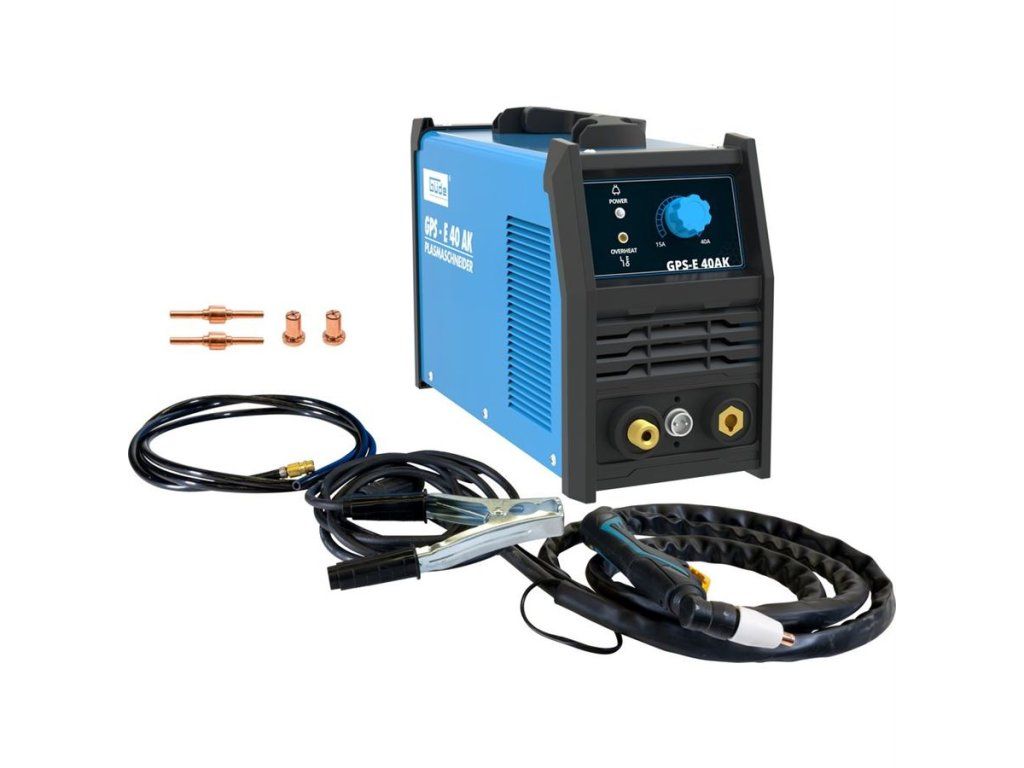Vybavení: 2,5 m plazmový hořák, zemnicí kabel se svorkou, řezací trysky Ø 1,2 mm (2), elektrody (2), vodítko.