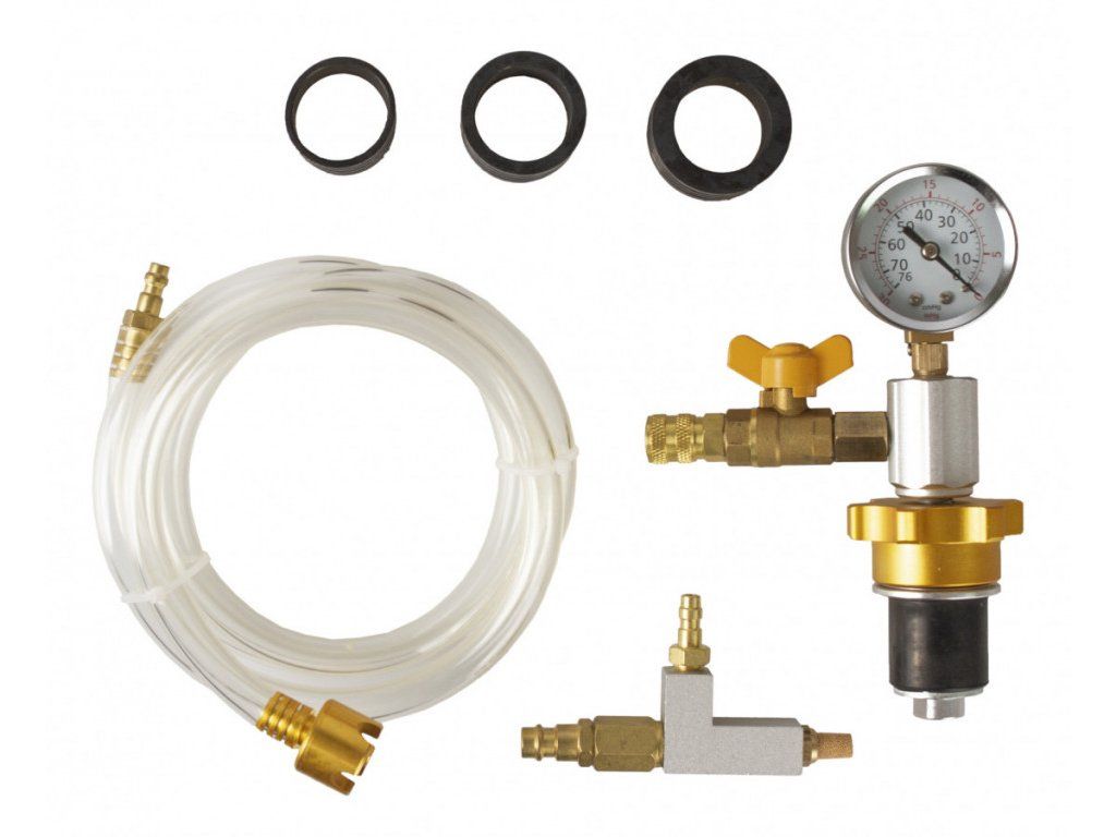Po připojení kuželového adaptéru s manometrem k vyrovnávací nádržce chladící kapaliny připojíte hadici stlačeného vzduchu k přístroji a vytvoříte podtlak v systému.