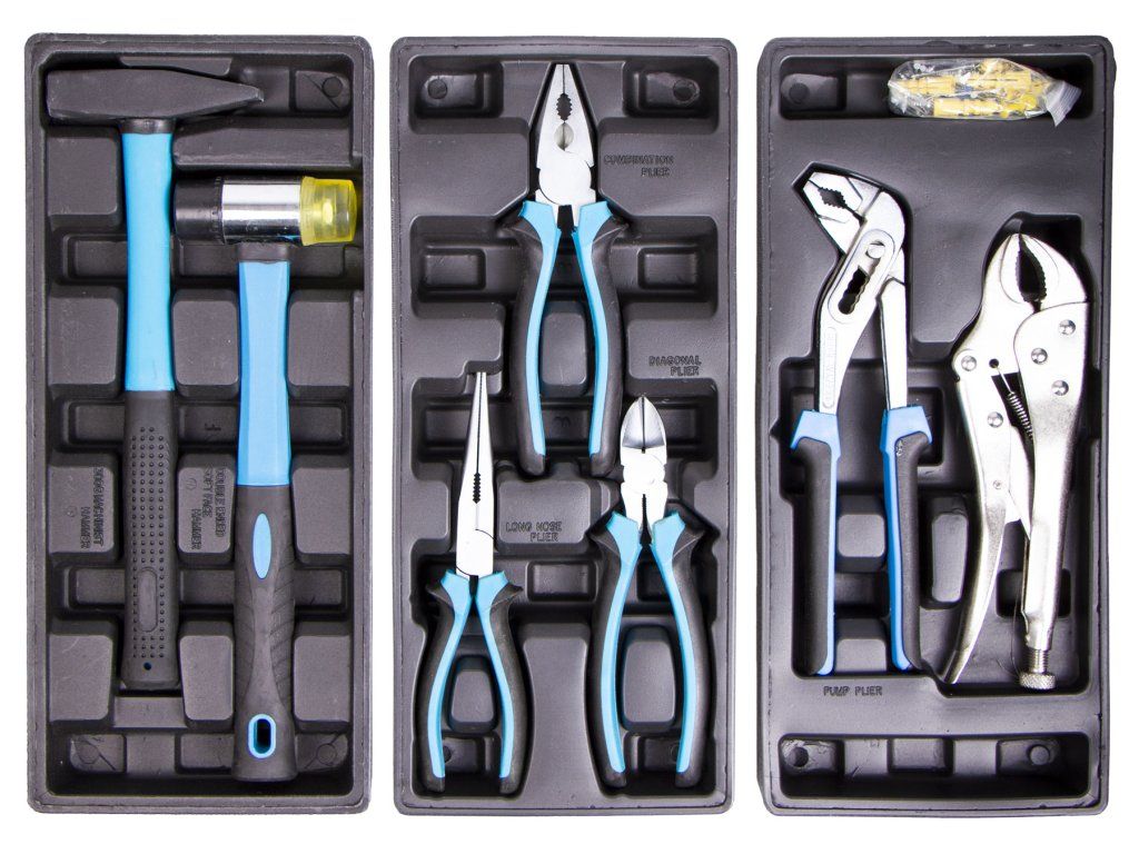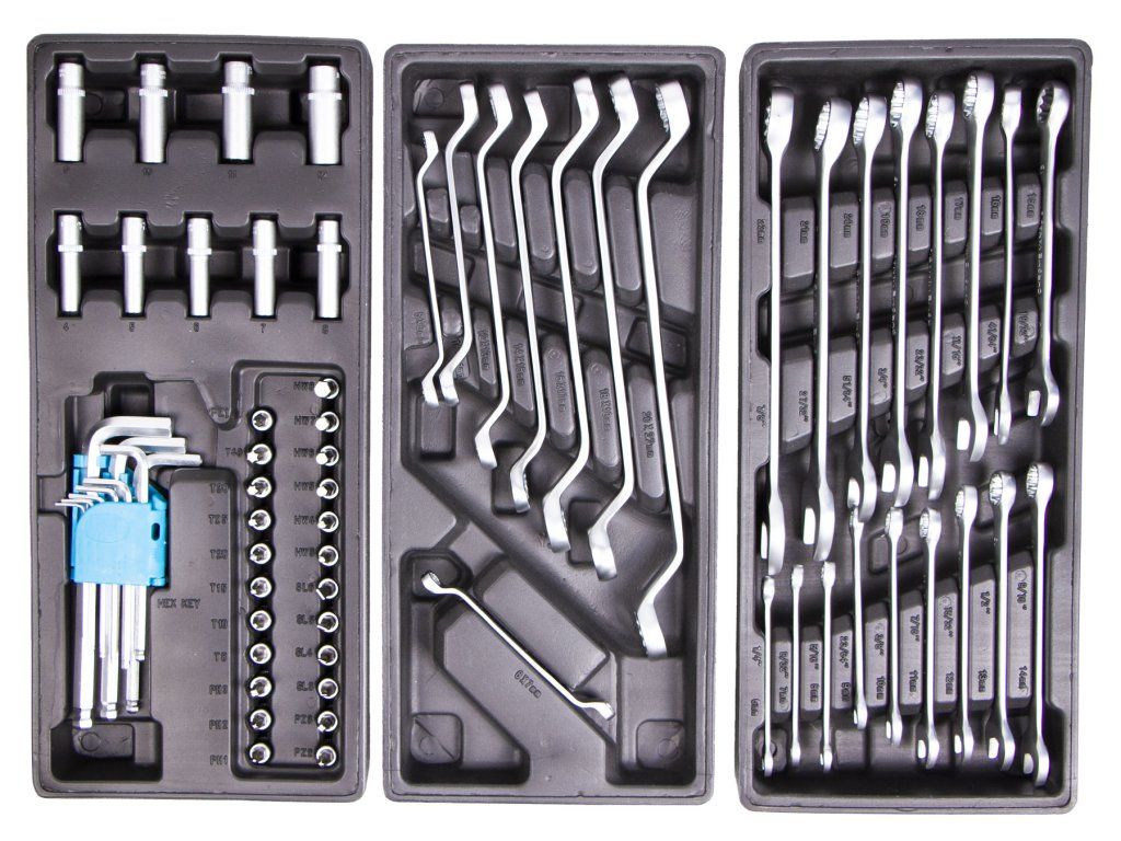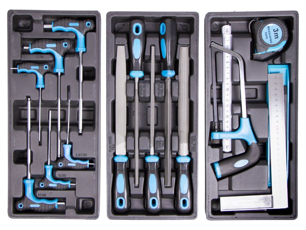 Nářadí je umístěno v 15 plastových výplních, které je možné bez problému vyjmout.