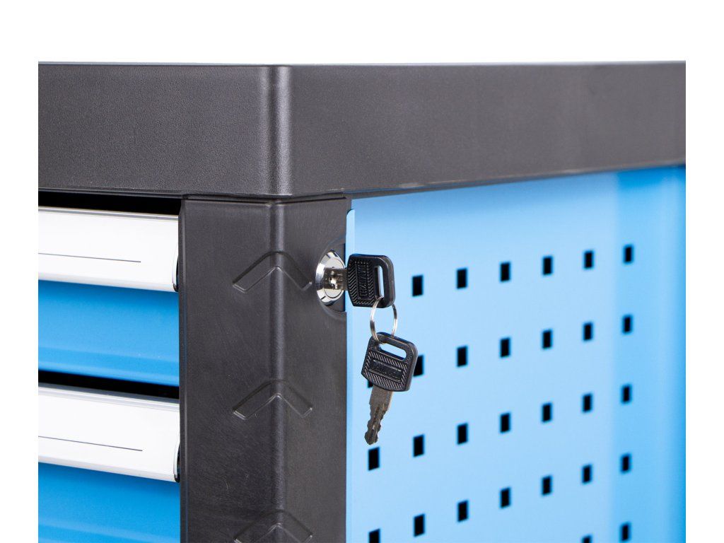 Modrý pojízdný kovový dílenský vozík se 7 šuplíky je vybavený nářadím nezbytným pro práci v dílně.