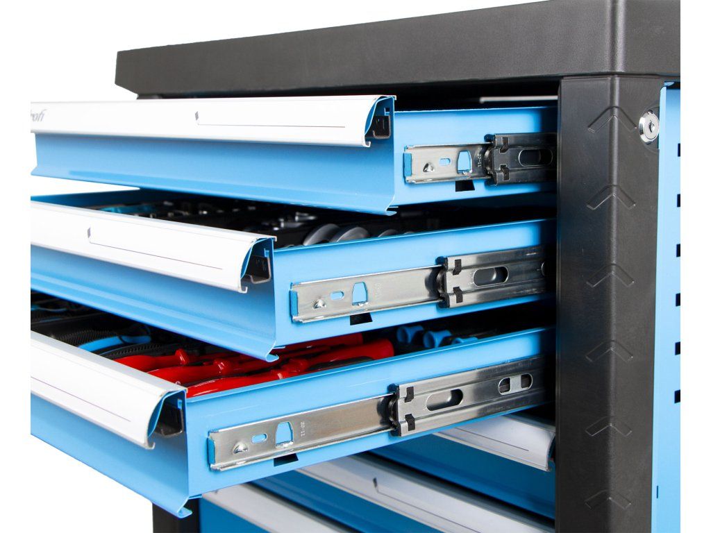 Pět horních zásuvek je vyplněno 272 ks ručního nářadí a 2 volné zásuvky nabízejí prostor pro možnost individuální výbavy nebo odložení např. elektrického nářadí nebo montážního materiálu.