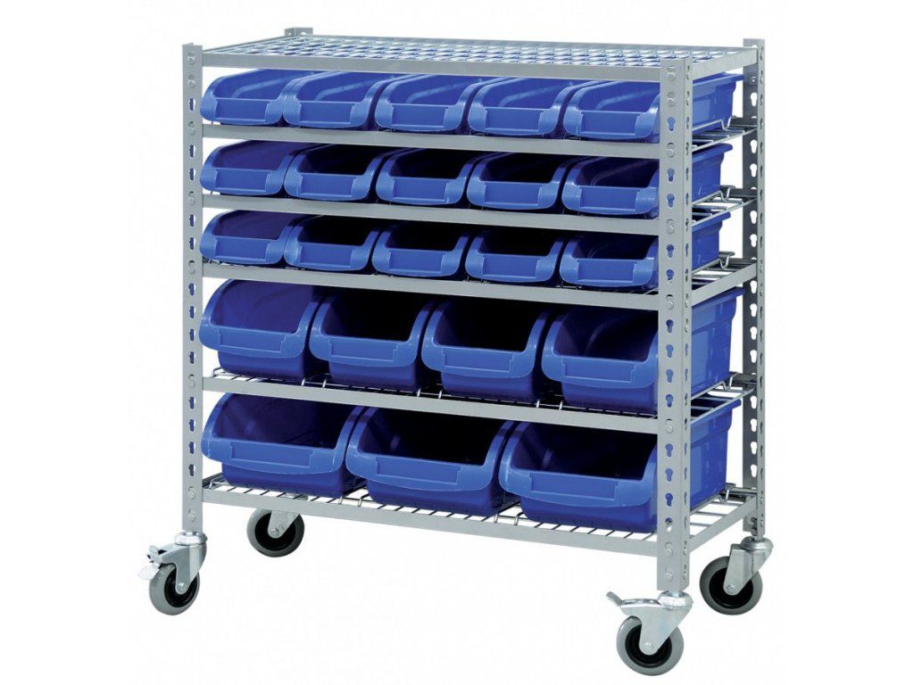 Regál s plastovými boxy je osazen 4 koly s možností aretace, z toho jsou 2 otočné.