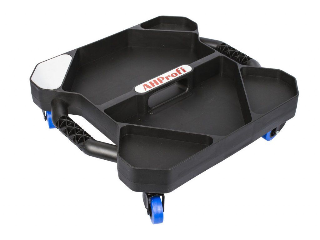 Rozměr 400 x 400 x 45 mm s odkládacím prostorem pro nářadí a drobný materiál. Vozík má po stránách a uprostřed madla pro snadný přenos. Vyrobeno z plastu.
