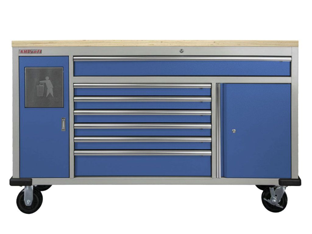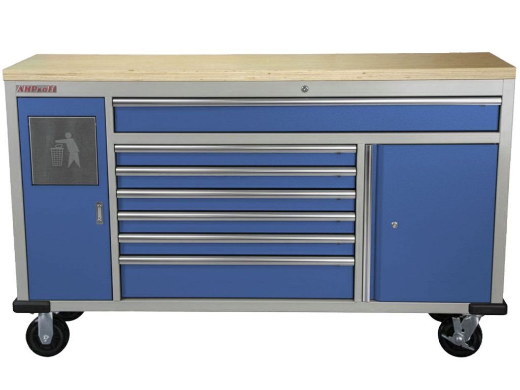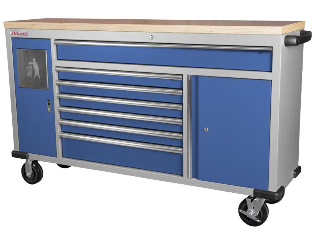 Pojízdný kovový dílenský stůl se 7 šuplíky, skříňkou a odpadkovým košem se bude hodit nejednomu profíkovi nebo kutilovi do jeho dílny.
