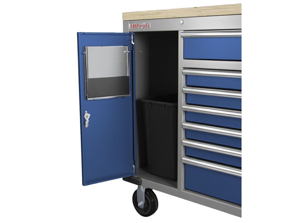 Dílenský vozík je celokovový se sedmi šuplíky, boční skříňkou a odpadkovým košem.