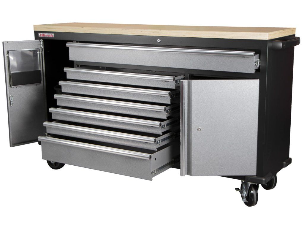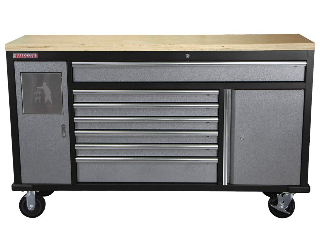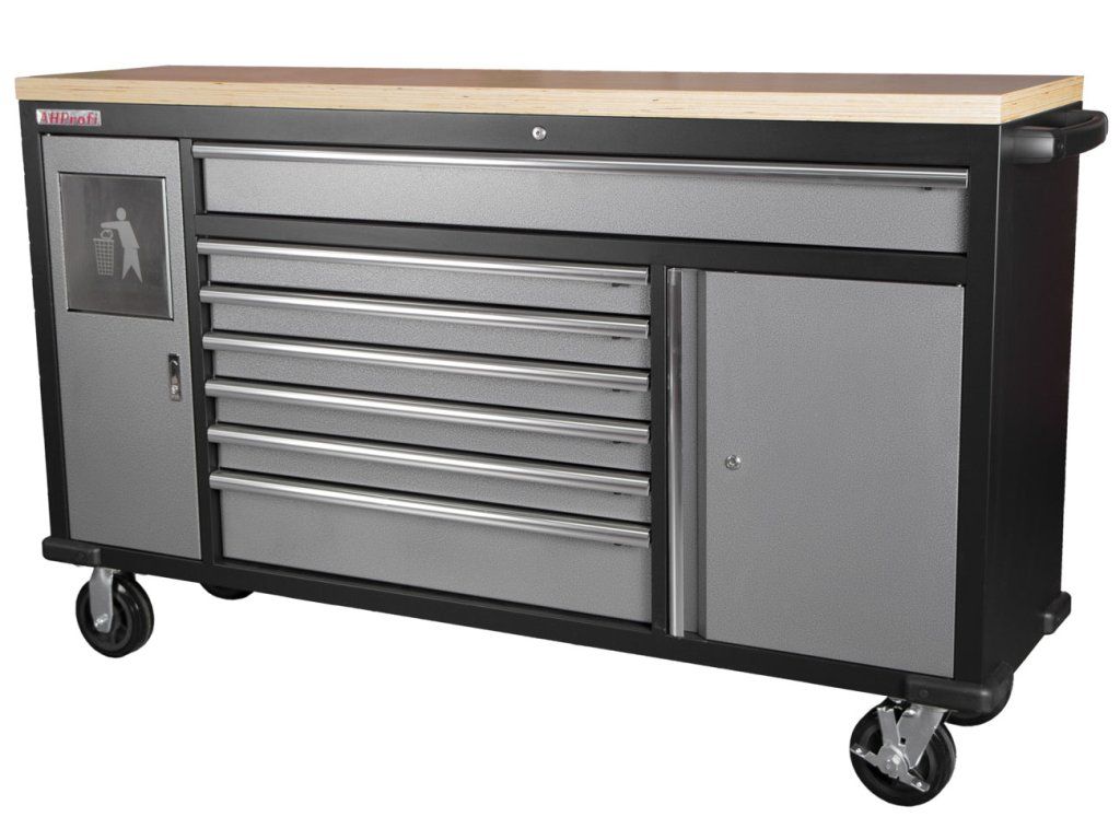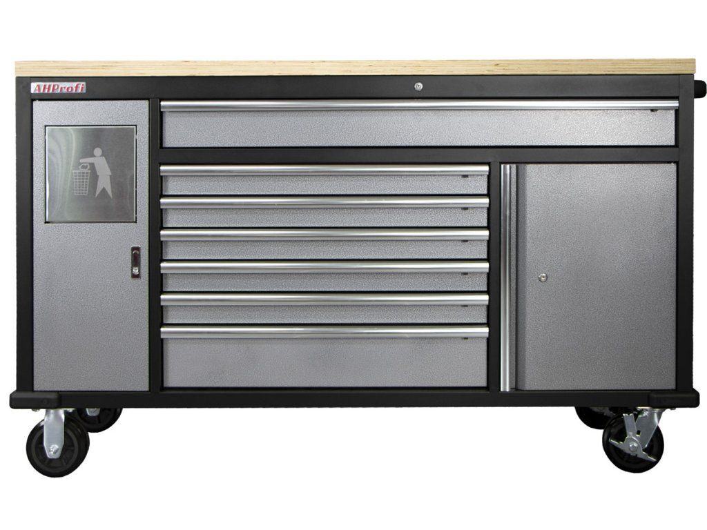 Pojízdný kovový dílenský stůl se 7 šuplíky, skříňkou a odpadkovým košem se bude hodit nejednomu profíkovi nebo kutilovi do jeho dílny.