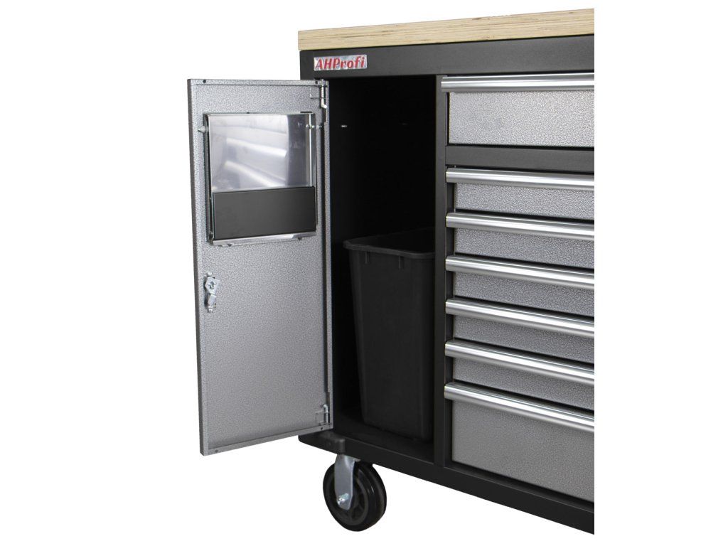 Dílenský vozík je celokovový se sedmi šuplíky, boční skříňkou a odpadkovým košem.