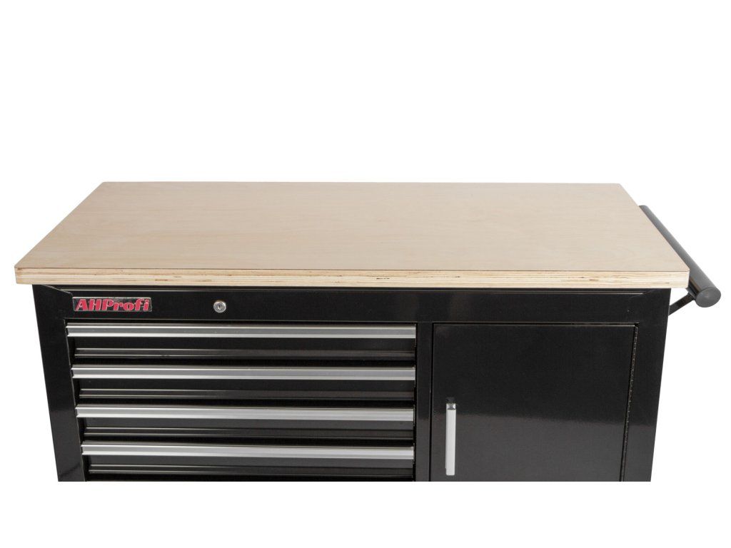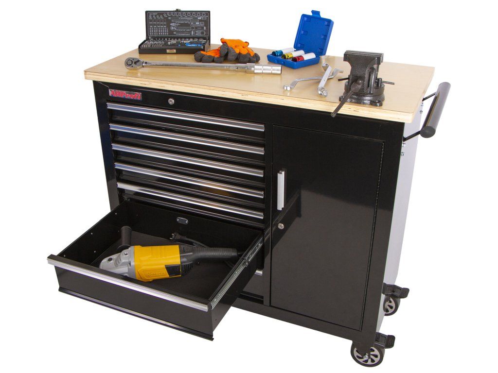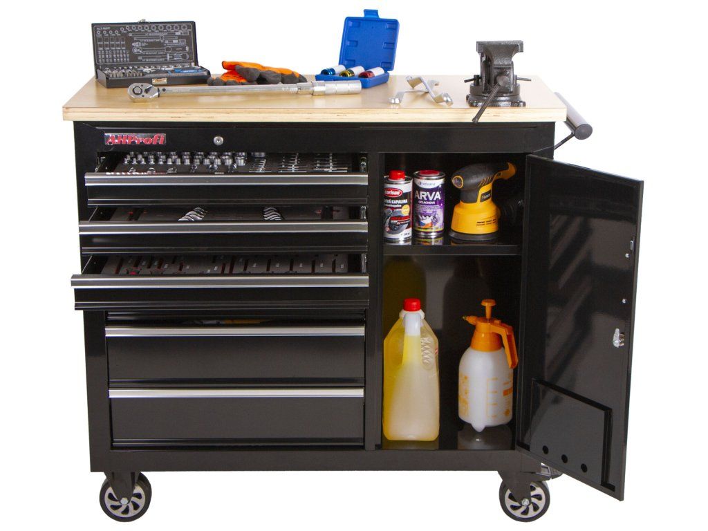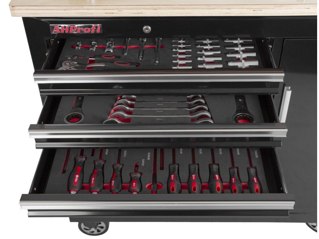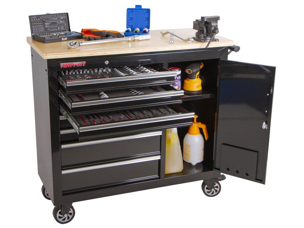 Vozík se skládá ze 7 zásuvek, uzamykatelné skříňky a masivní dřevěné pracovní desky se svěrákem.