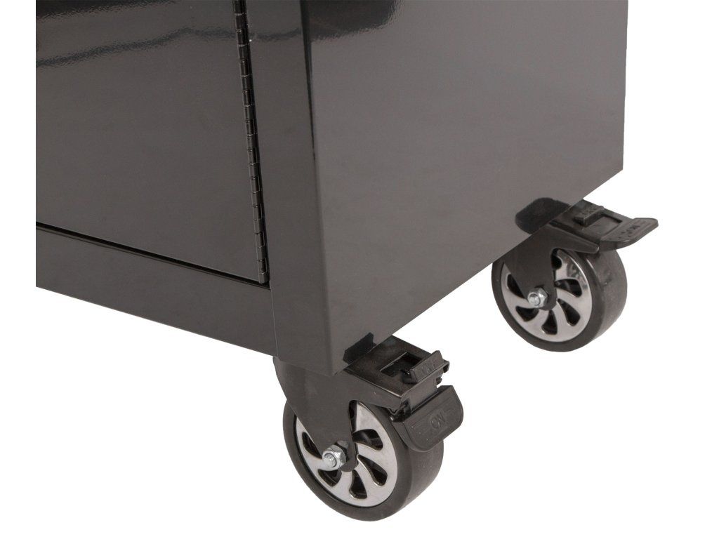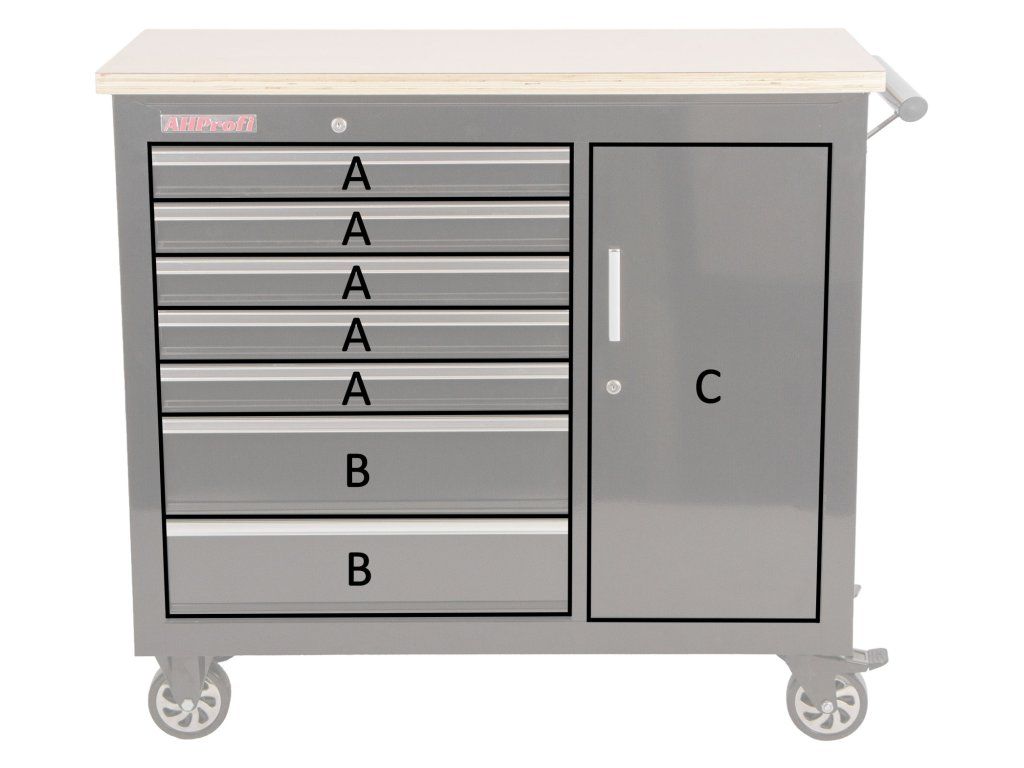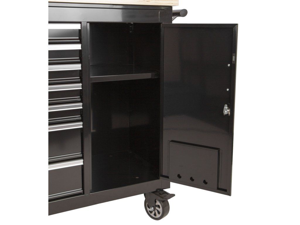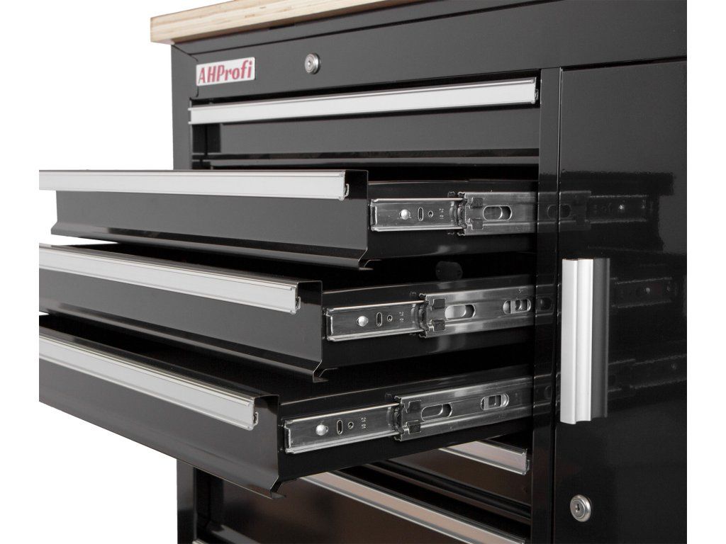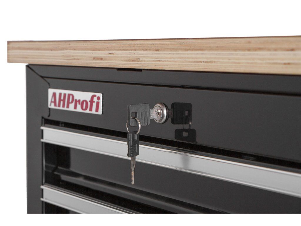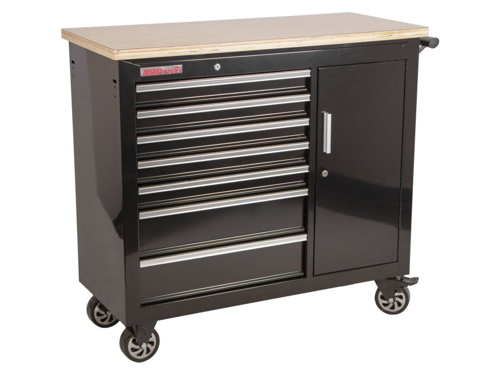 Vozík se skládá ze 7 zásuvek, uzamykatelné skříňky a masivní dřevěné pracovní desky se svěrákem.