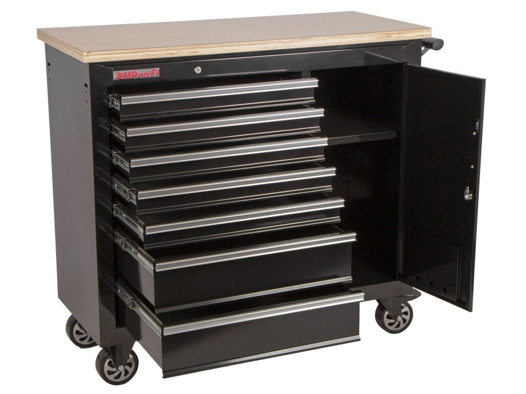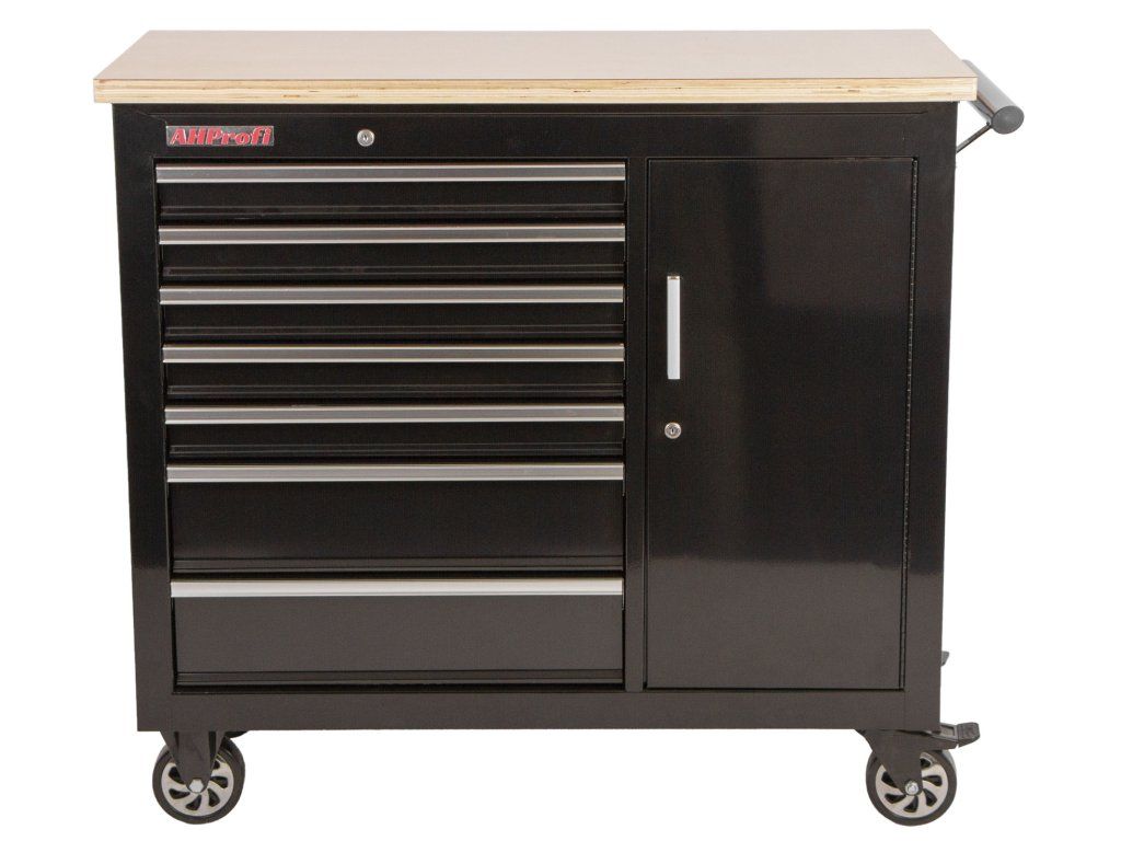Dílenský vozík je celokovový se sedmi zásuvkami, uzamykatelnou skříňkou a pracovní plochou.