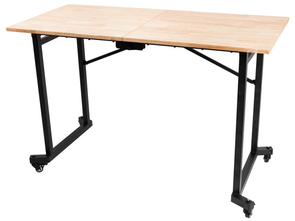 Skládací dílenský stůl určený pro práci v dílnách, garážích a provozech, kde je potřeba flexibilní pracovní plocha s možností rychlého složení a snadného přesunu.