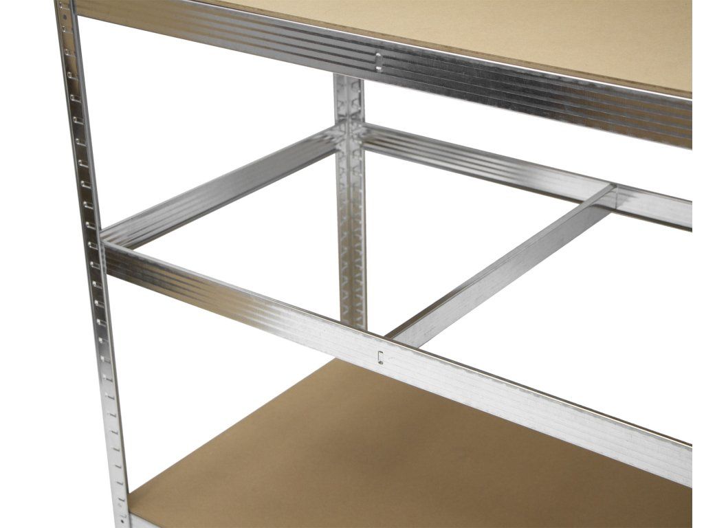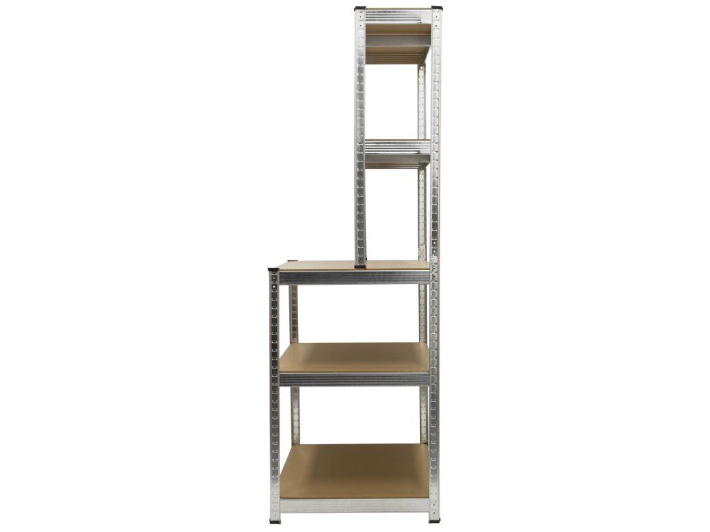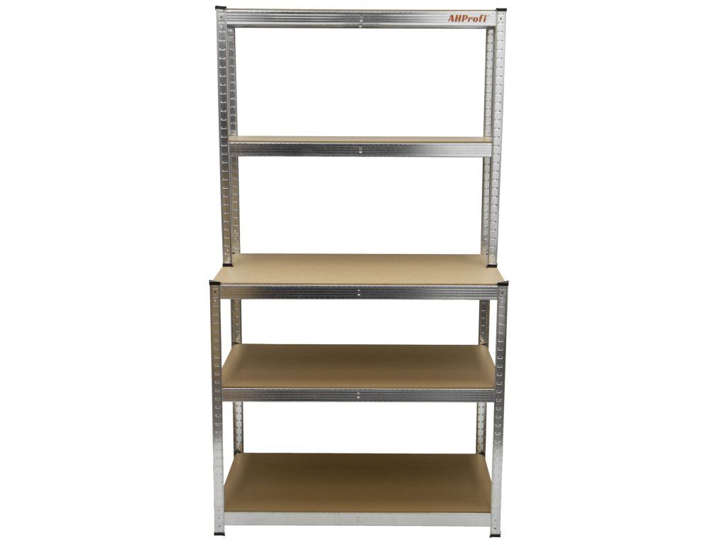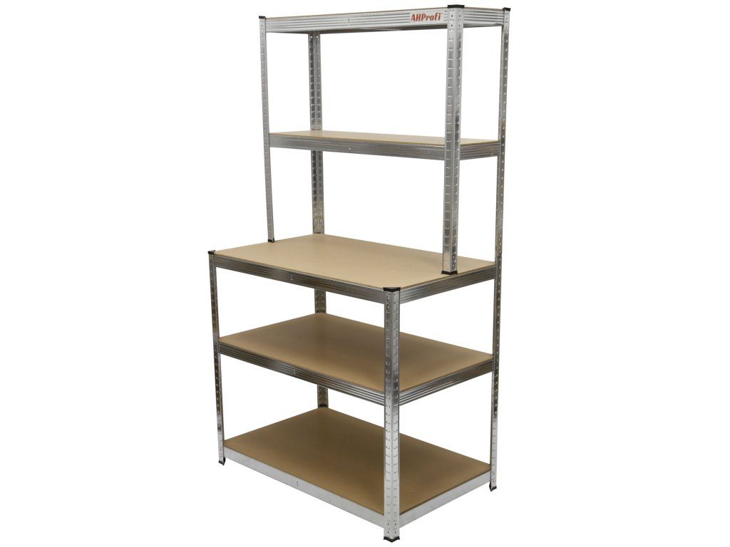 Unikátní spojení policového regálu a pracovního stolu je skvělou volbou pro dílny, garáže, technické místnosti, ale své využití najde i v domácnostech, obchodech a skladech.