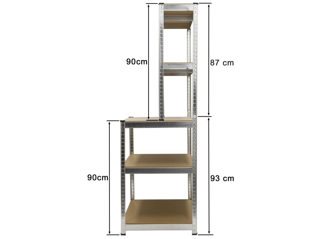 Tento regál je rozdělen na 2 části: dolní část o výšce 900 mm slouží jako stabilní pracovní plocha, zatímco horní část poskytuje 3 další police na nářadí, materiál nebo jiné pomůcky.