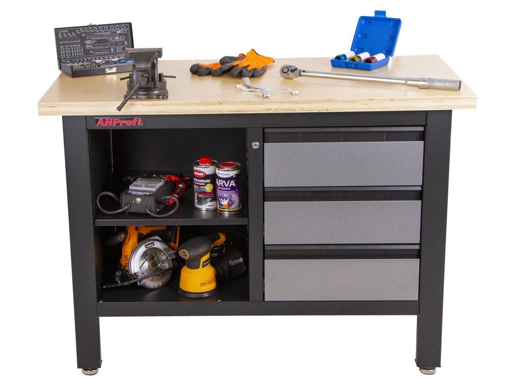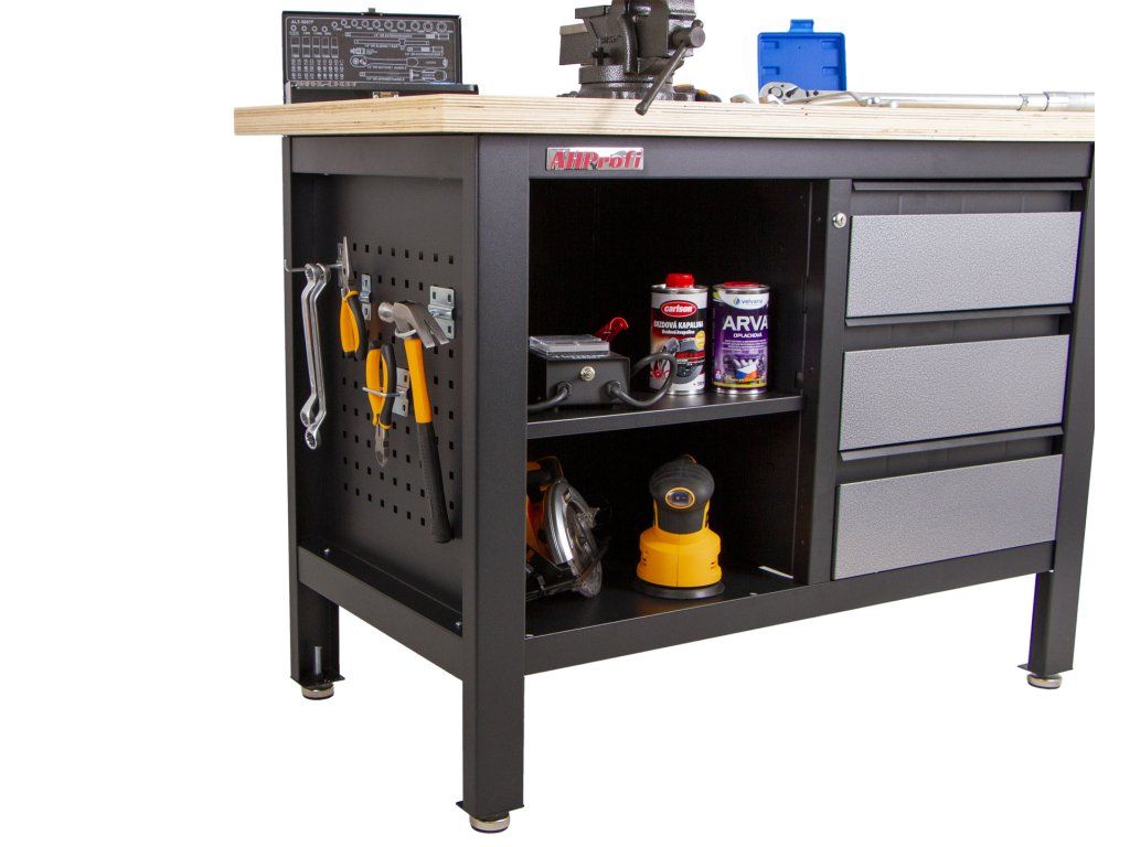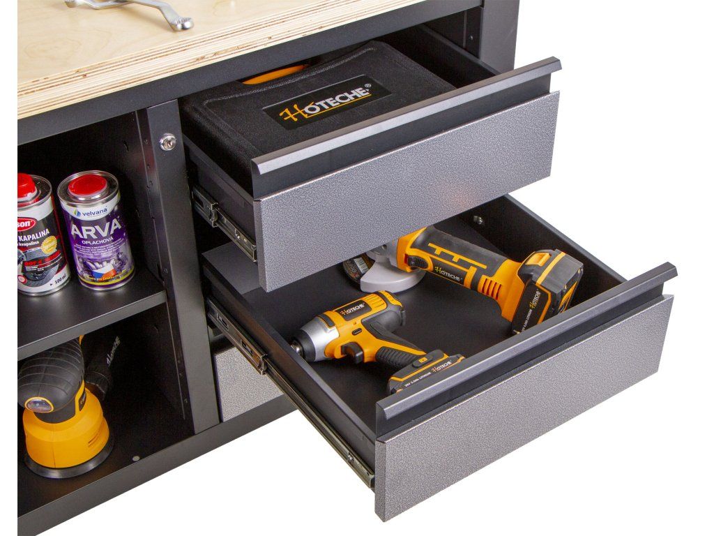 Do šuplíků můžete uskladnit svoje nářadí jako např. utahovák nebo úhlovou brusku.