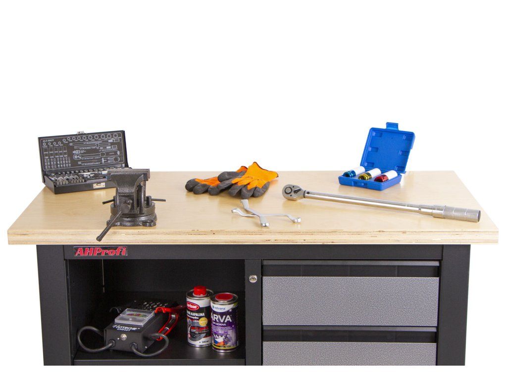 Na pracovní dřevěnou desku o rozměrech 1200 x 600 mm se vejde spousta používaného nářadí, jako např. gola sada nebo momentový klíč.