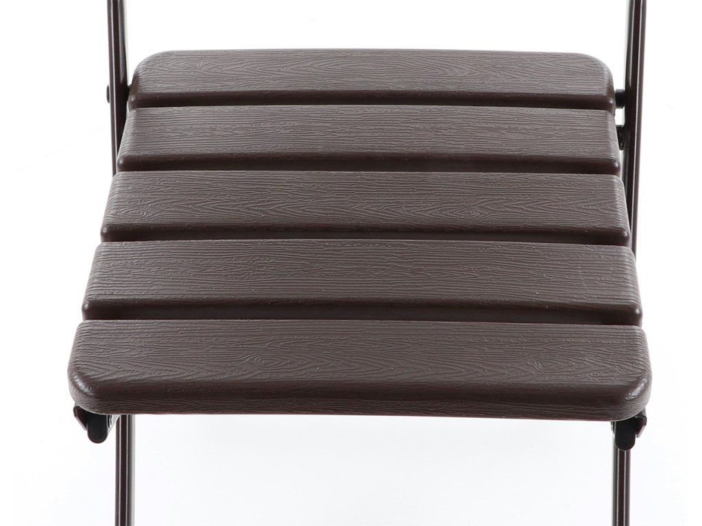 Skládací židle z ocelových profilů povrchově dokončena komaxitovou barvou, čalounění je v imitaci masivního dřeva z lisovaného plastu s UV filtrem, určená do interiérů, exteriérů a pergolových prostor.