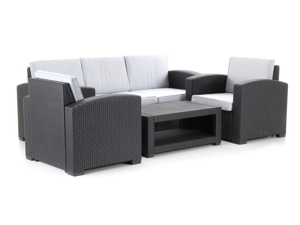 Nábytek PORTORIKO GREY DeLuxe má originální povrchovou strukturu napodobující přírodní ratan. Ideální pro pohodlné venkovní posezení na vaší zahradě či terase.