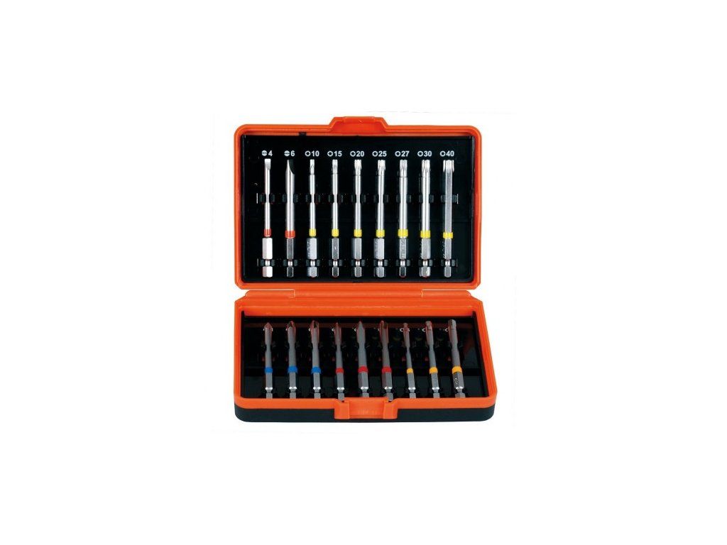 Sada bitů 1/4" s barevným rozlišením, 75 mm, 18 dílů - 2x ploché (4 - 6 mm) - 3x PH (1 - 2 - 3) - 3x PZ (1 - 2 - 3) - 3x imbus (3 - 4 - 5 mm) - 7x TX (10 -15 - 20 - 25 - 27 - 30 - 40)Doplňkové parametry
