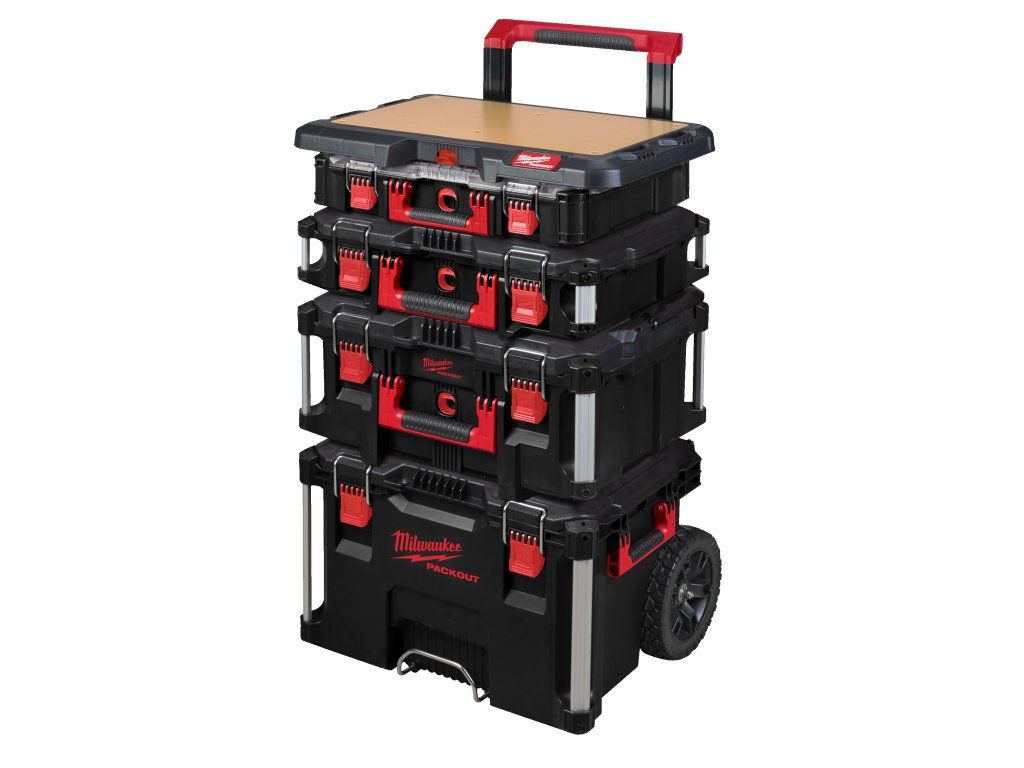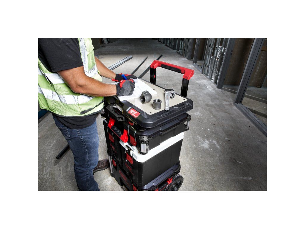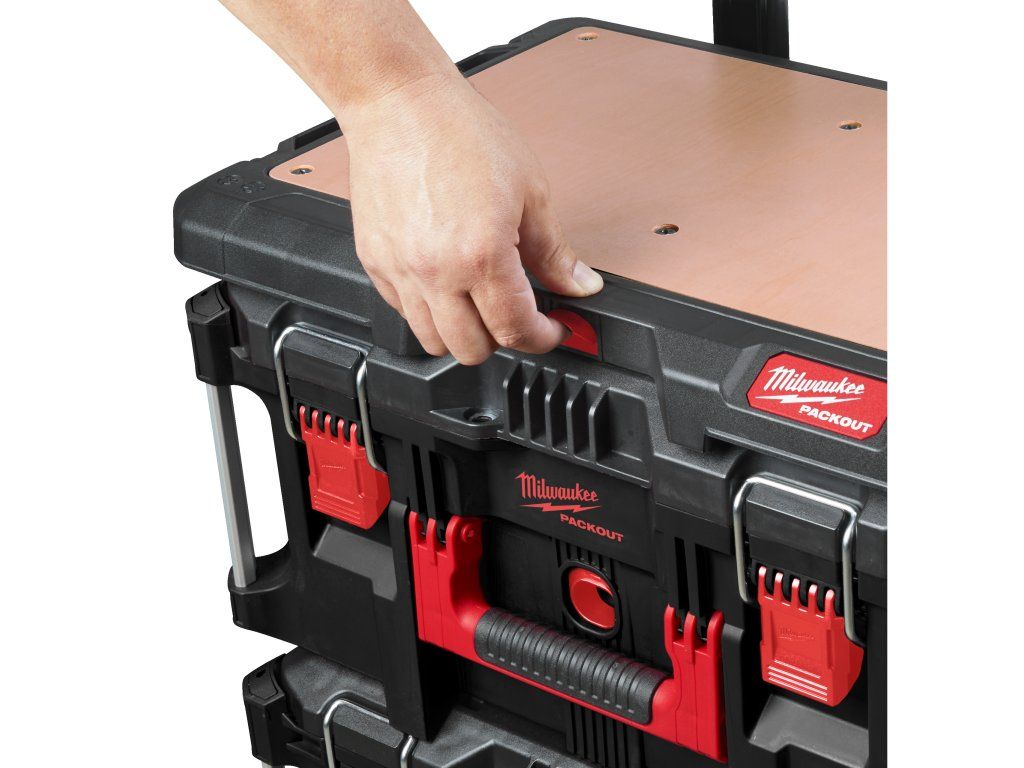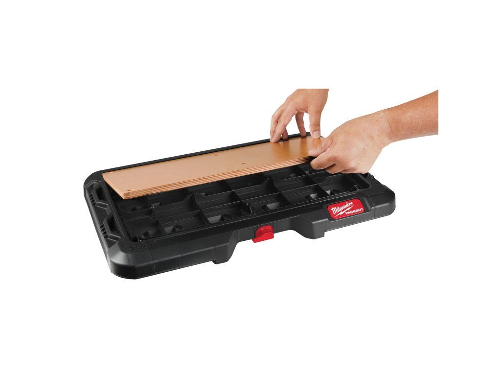- Povrch připravený pro upevňování umožňuje snadnou montáž běžných pracovních materiálů a větších druhů nářadí na horní části skladovacího systému PACKOUT™.