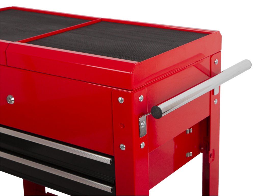 Stolek nabízí 2 zásuvky o rozměrech 587 x 325 x 60 mm s kuličkovými ložisky pro hladký pohyb. Disponuje 4 odolnými kolečky, z toho 2 s aretací pro lepší stabilitu.