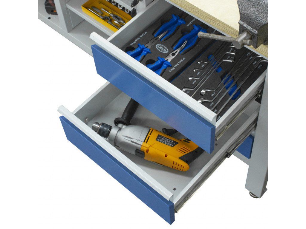 - Nosnost pracovní desky 300 kg pro těžké stroje, svěráky i velké sady nářadí.