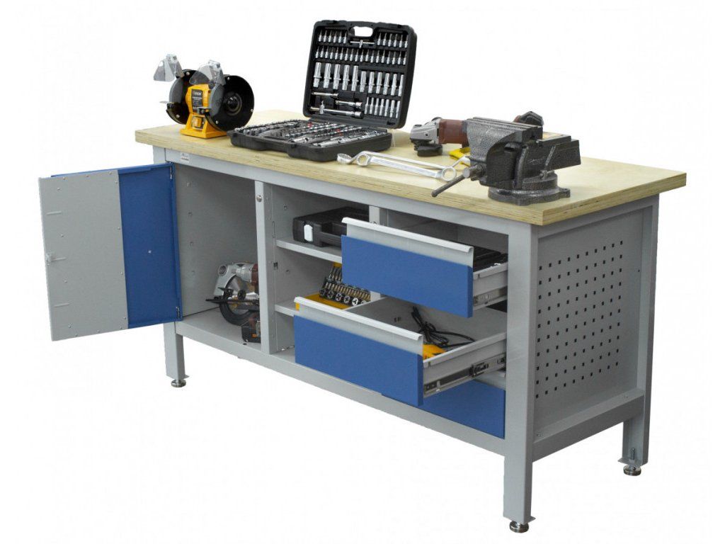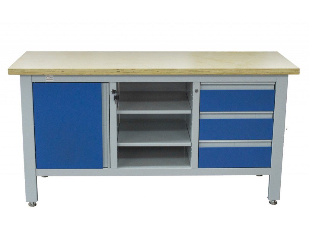 Stůl je vybavený dřevěnou pracovní deskou o rozměrech 1690 × 600 mm, uzamykatelnou skříňkou, 3 zásuvkami a 3 regály uprostřed ponku.