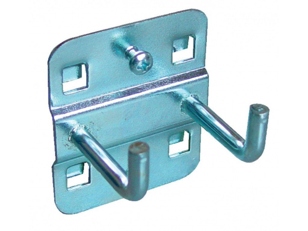 Dvojitý hák s pravoúhlým zakončením je určen pro děrované desky s roztečí 38 x 38 mm. Lze jej připevnit také na perforované panely sestav dílenského nábytku, dílenské vozíky, pracovní stoly a policové regály.