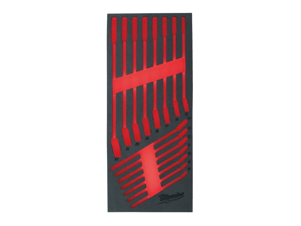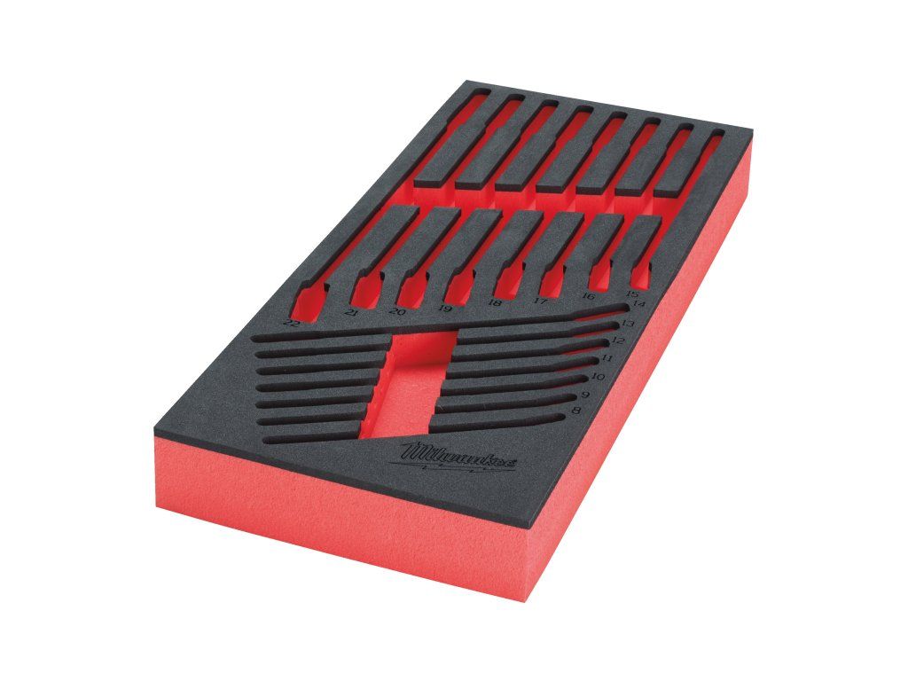 - Odolné pěnové vložky pro úhledné uložení nářadí Milwaukee do ocelových vozíků.