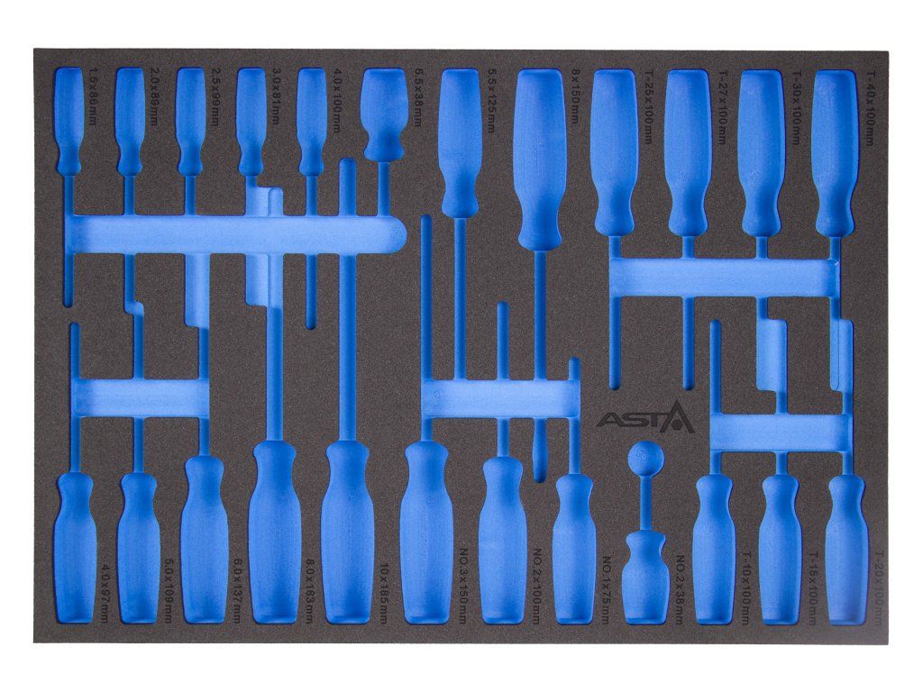 Prázdná pěnová vložka pro šroubováky. Vložka najde využití při organizaci vašeho nářadí v dílenských vozících nebo pracovních stolech.