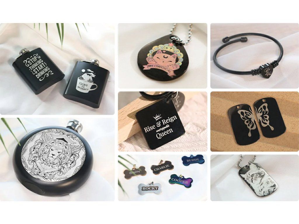 - Popisovací fiber (vláknový) laser je určen pro gravírování eloxovaných i neeloxovaných slitin hliníku, ocelí, nerezových ocelí, stříbra, zlata, plastů, kamene a kůže