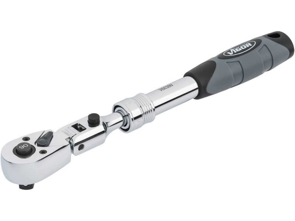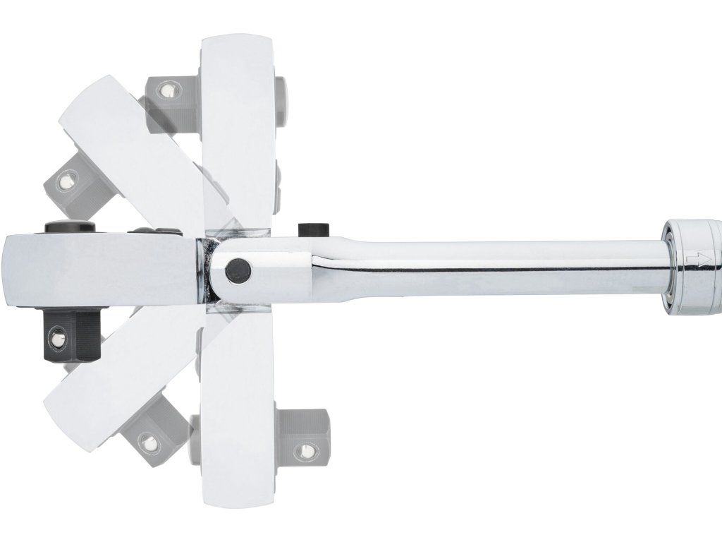 Teleskopická ráčna určená pro precizní utahování a povolování šroubových spojů v dílně i servisu, vhodná pro práci v omezeném prostoru díky kloubové hlavě.