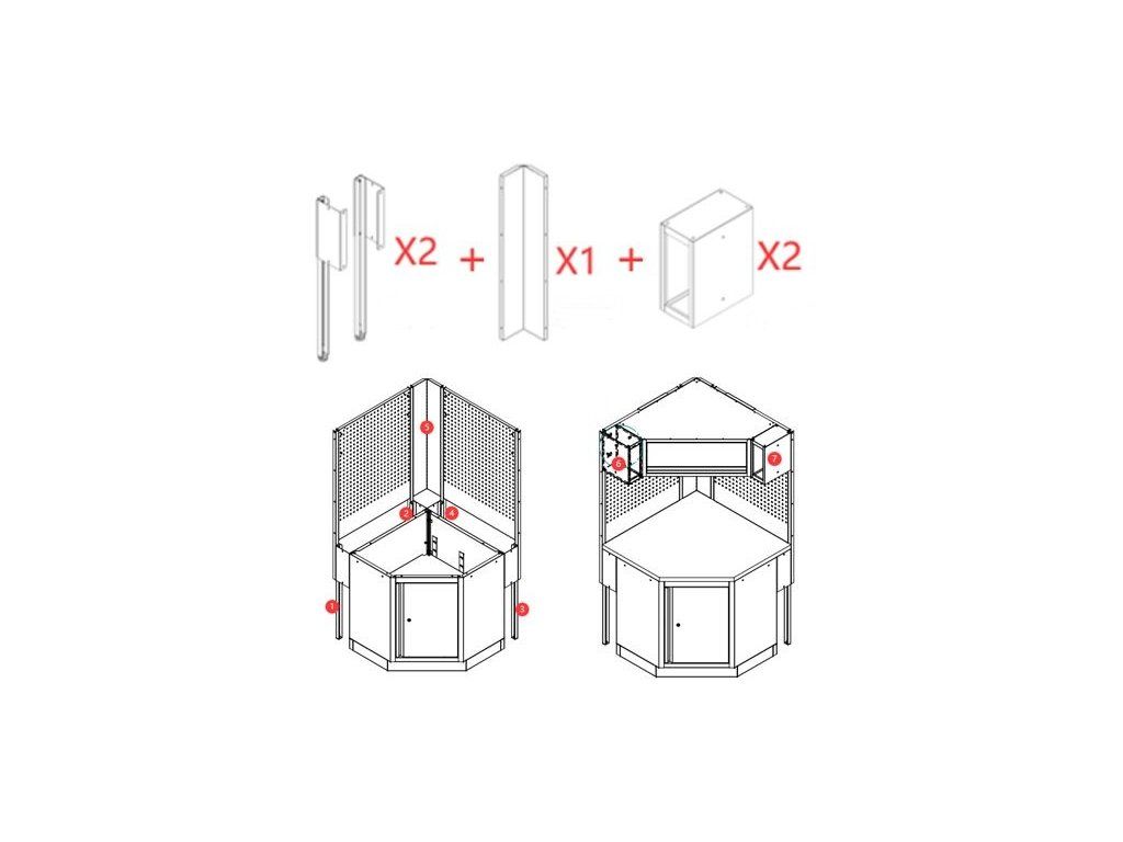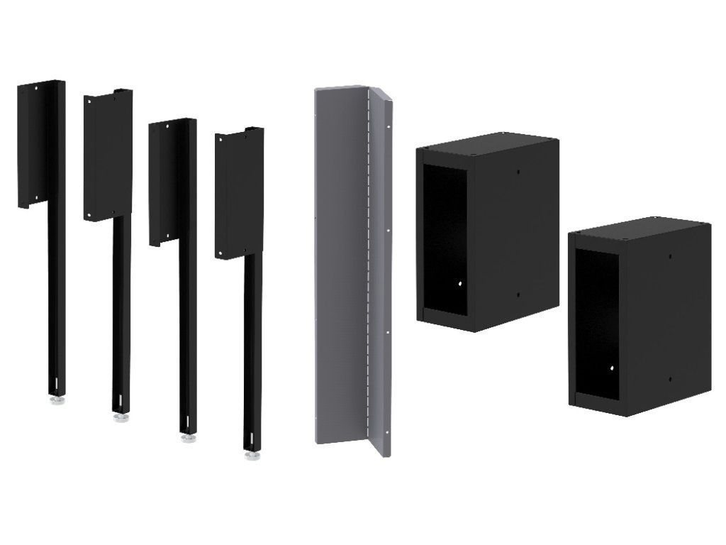 Obsahuje 2x 2 prodlužovací sloupky TSB131, které navýší hloubku skříňky, 1 ks středového rohového spojovacího dílu pro perforované desky a 2 ks distančních modulů pro horní rohovou skříňku.