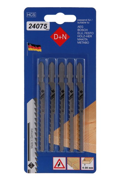 Materiál:WS ocel Pracovní délka 75mm Tlouštka: 1,45mm Rozteč zubů: 2,5mm/1,2mm Typ ozubení: Podbroušené Úchyt: Bosch Použití:tvrdé a měkké dřevo, překližka do tl. 60mm, dřevotříska, pro řezání oblouků o malém poloměru, plasty do tl. 30mm Čistý řez/Řez oblouků. Instruktážní video