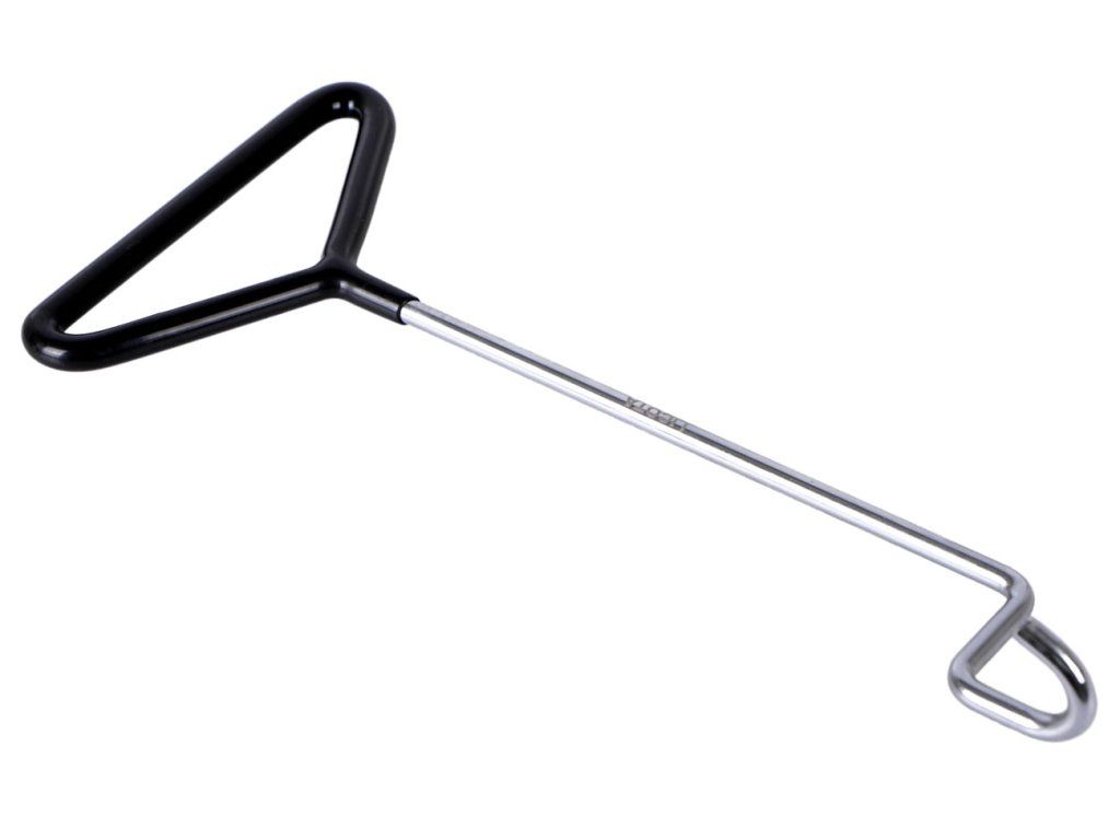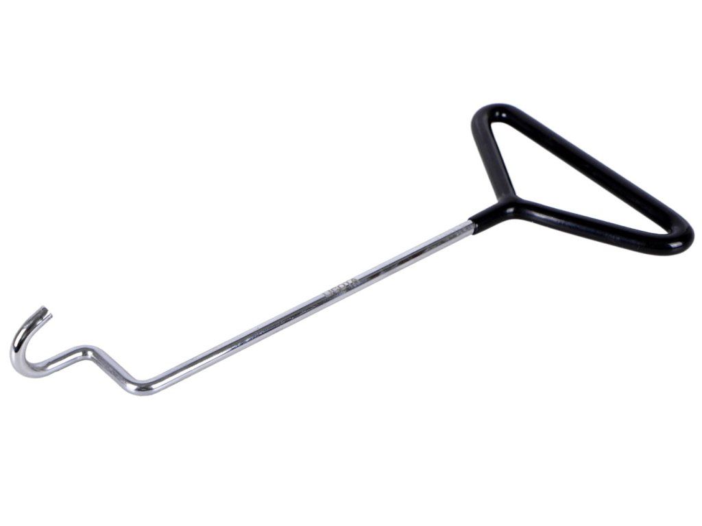Pevná ocelová konstrukce zakončena hákem a pogumovanou rukojetí pro snadný a pevný úchop.