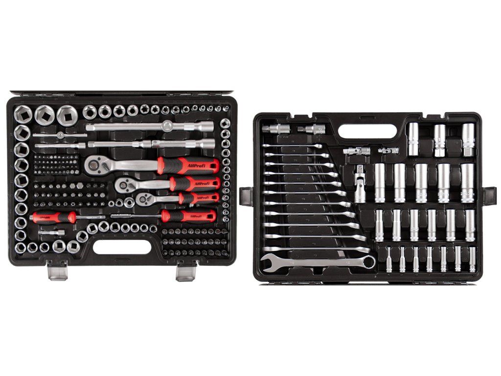 - Komplexní obsah včetně ráčen, očkoplochých klíčů, nástrčných klíčů, bitů aj.