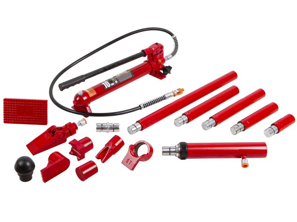 Konstrukci tvoří hydraulický válec se silou 10 tun a kvalitní příslušenství uložené v praktickém plastovém kufru s kolečky pro snadnou manipulaci.