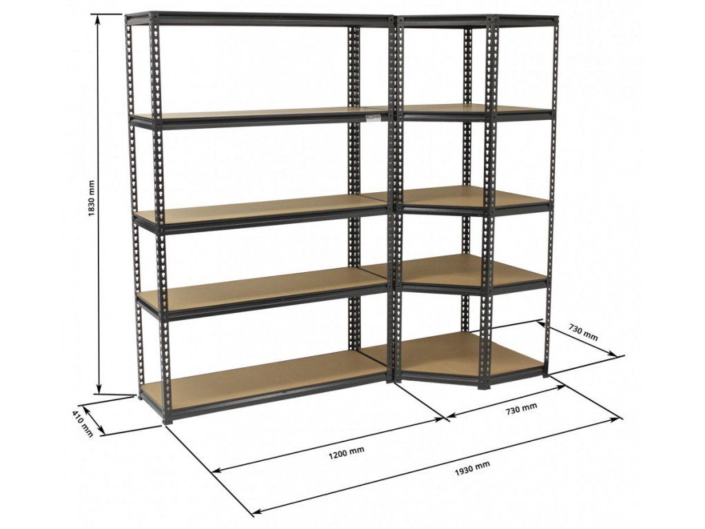 - Nosnost rohového regálu: 150 kg/police (při rovnoměrném rozložení zátěže).