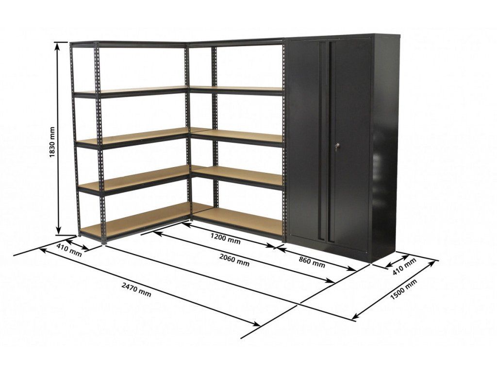 Regálový systém obsahuje klasický rovný regál o šířce 1500 mm, rovný regál a šířce 1200 mm a uzamykatelnou dílenskou skříň o šířce 860 mm.