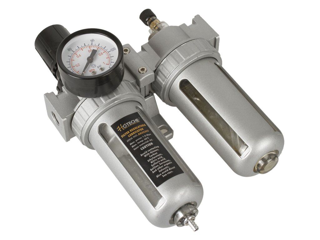 Regulátor tlaku vzduchu s odlučovačem vody a přimazáváním pro pneumatické nářadí.