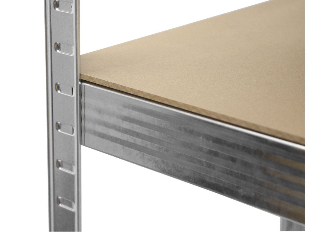 Regál je vybaven 5 stabilními kovovými stojinami z ocelového plechu o tloušťce 0,6 mm, které zajišťují pevnost a stabilitu celé konstrukce. Police lze výškově přizpůsobit po 22 mm, takže si snadno nastavíte uspořádání dle vlastních potřeb.
