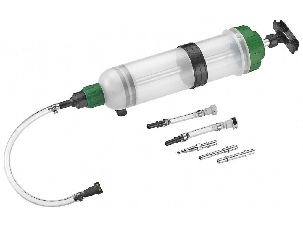 - Ruční plnička a odsávačka nafty a benzínu typu injekční stříkačka s obsahem zásobníku 1,5 l.