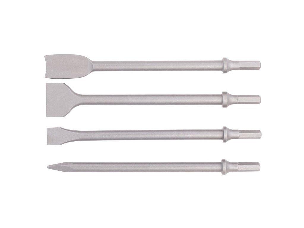 Sada 4 sekáčů - špičatý 250 mm, plochý 19 × 250 mm, plochý široký 40 × 250 mm, půlkulatý 30 × 250 mm.