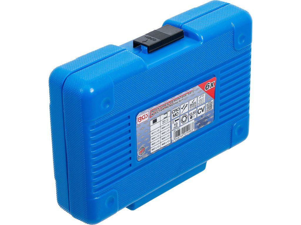 Přípravek na demontáž vstřikovačů v sadě 6 ks adaptérů přehledně uložených v plastovém kufříku.
