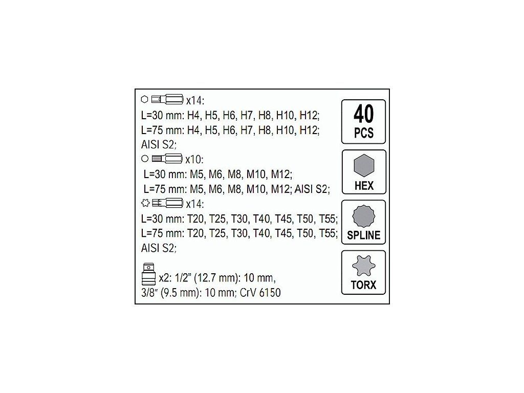 V sadě naleznete nejpoužívanější bity s profily H (Imbus) - šestihran, M (XZN, SPLINE) - tisícihran a T (Torx) - hvězdička s tvrdostí 58 - 62. Hroty bitů odpovídají normě AISI S2. Bity se pomocí adaptérů ze slitiny ocele Cr-V 6150 upnou na ráčnu. Bity je možné přímo používat s řáčnou na bity nebo vrtačkou a aku-šroubovákem.
