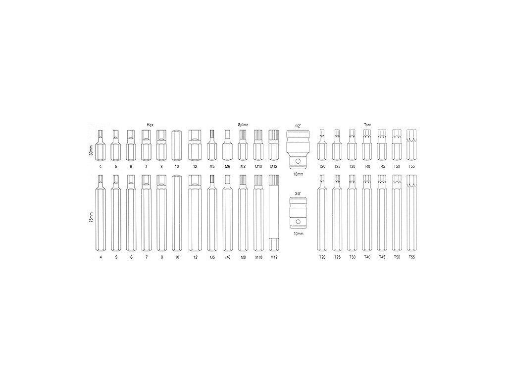 - T20, T25, T30, T40, T45, T50 a T55 (Délka 75 mm.).