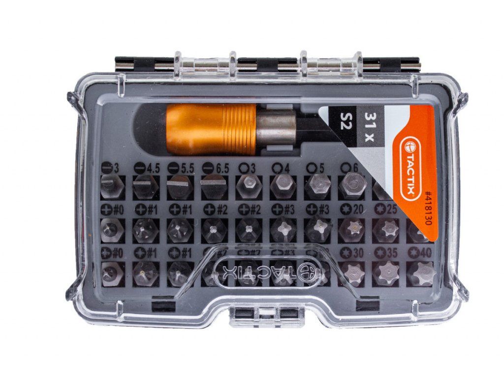Sada 31 kusů bitů s adaptérem nesmí chybět u žádné AKU vrtačky a šroubováku nebo šroubováku na bity. Sada je přehledně uložena v plastovém boxu.