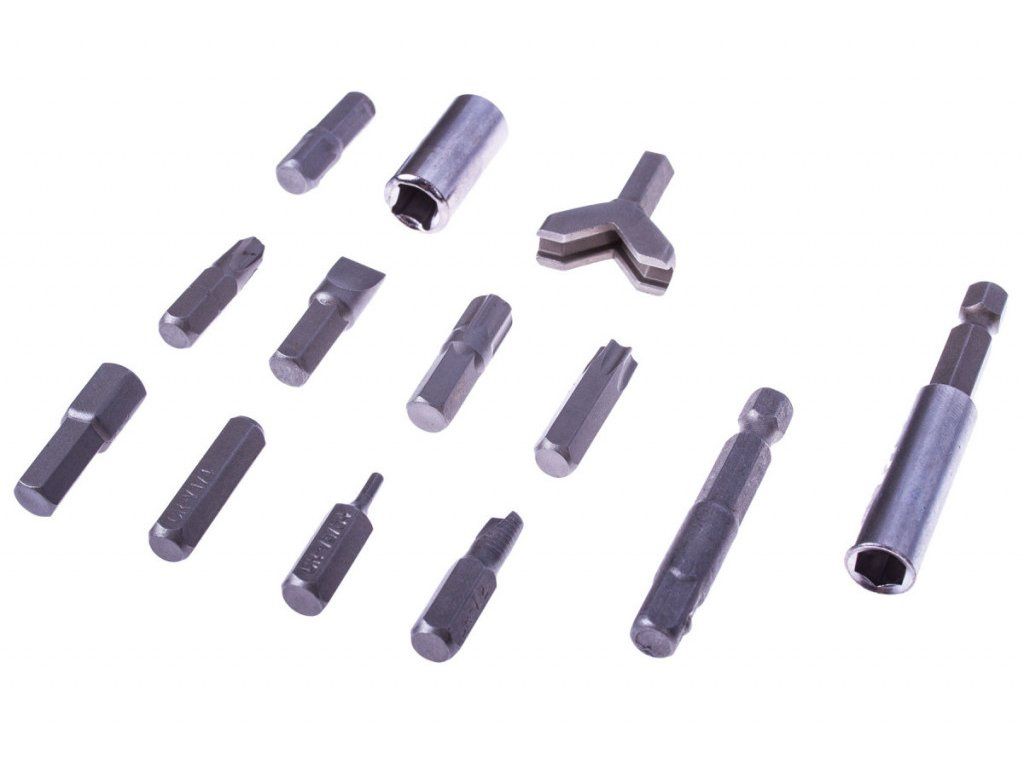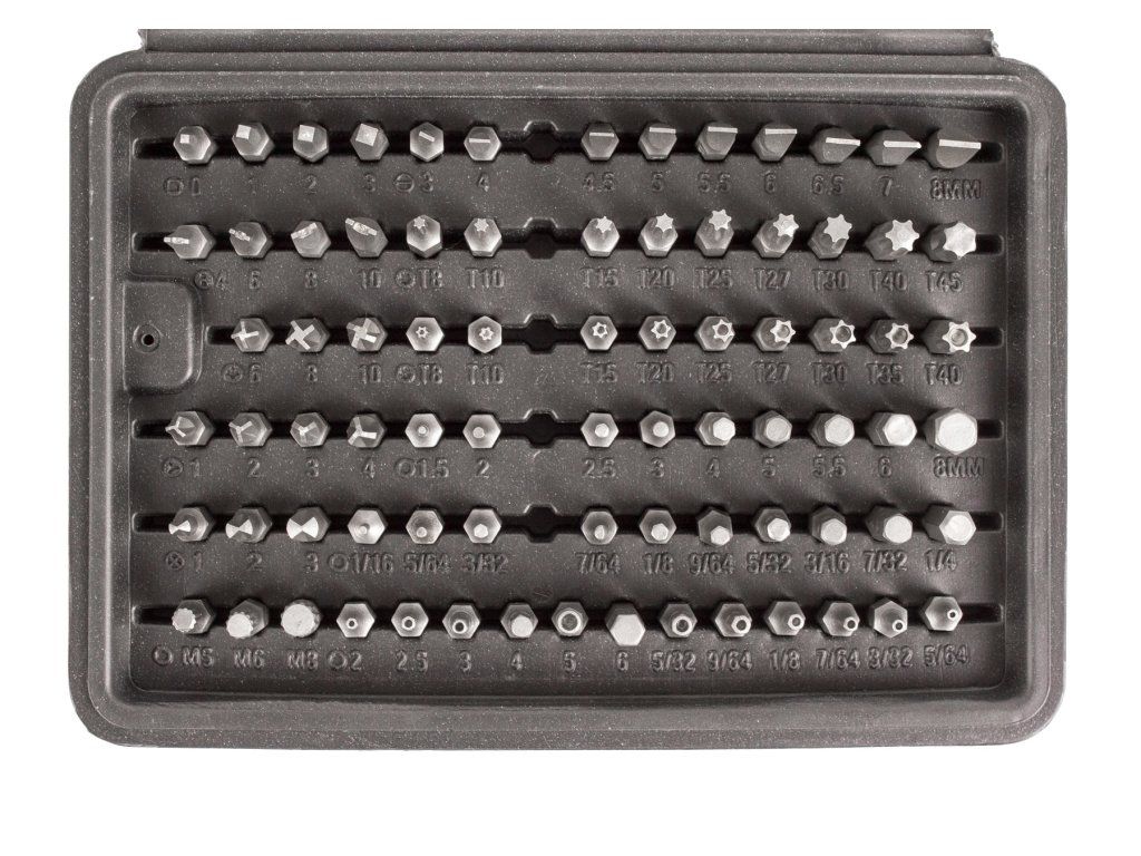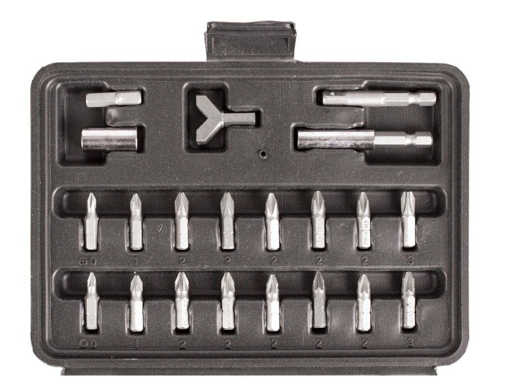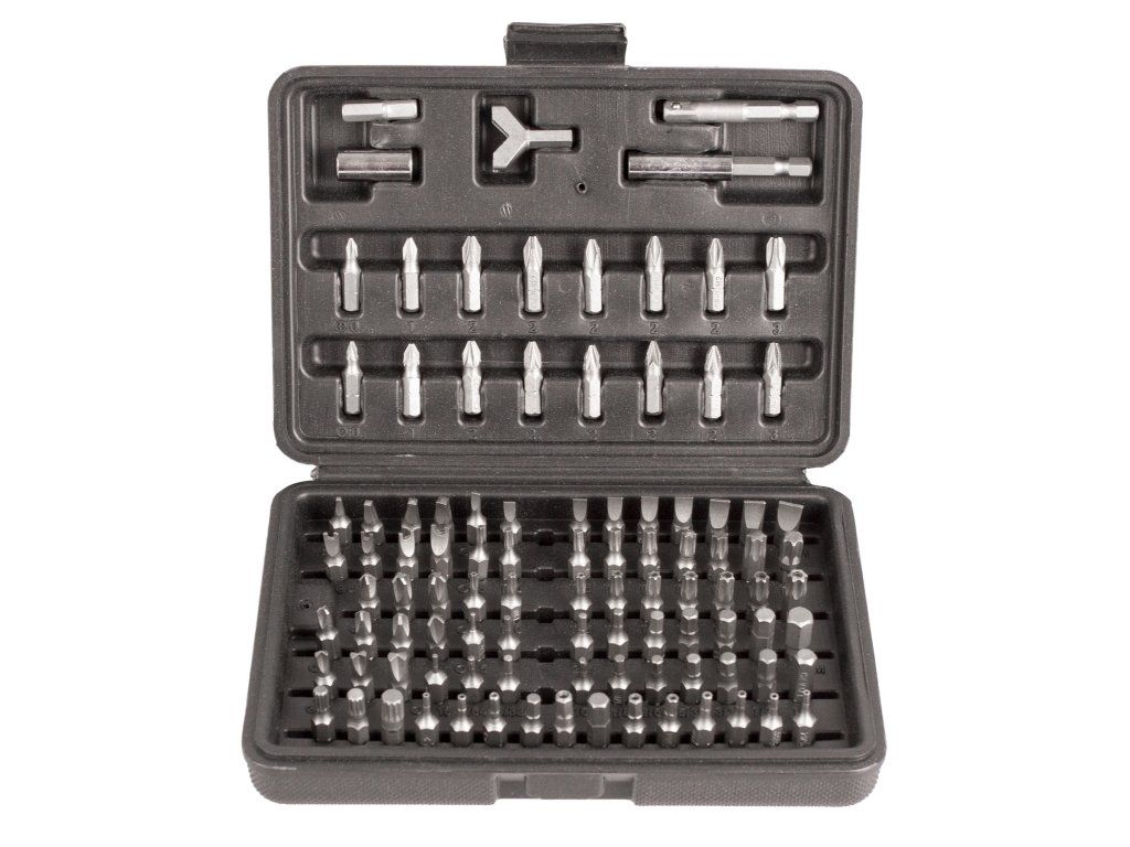 Komplexní sada bitů v plastovém kufru se 100 díly. Sada se dobře skladuje i přenáší a snadno udržíte pořádek mezi jednotlivými bity. Díky přehlednému uložení lze snadno kontrolovat kvalitu/unavenost jednotlivých dílů a případně je vyměnit. Bity jsou obsaženy v nejběžněji používaných rozměrech, takže se hodí do profi dílny i pro domácí dílnu.