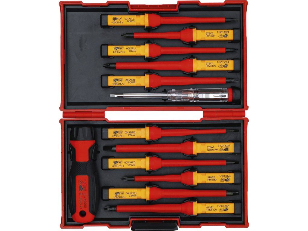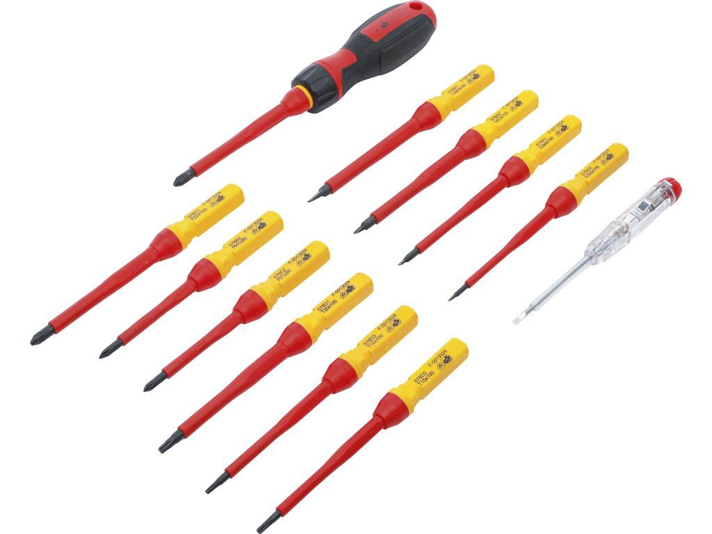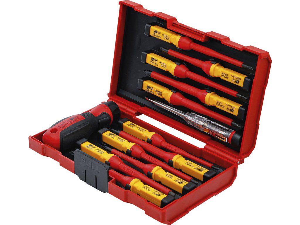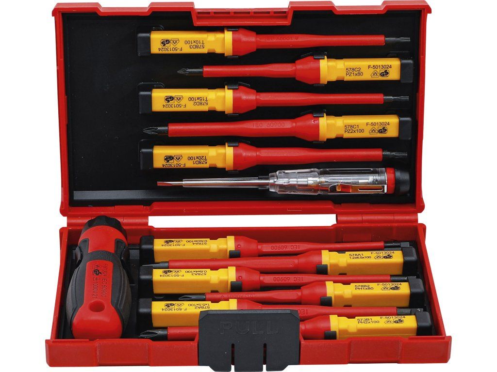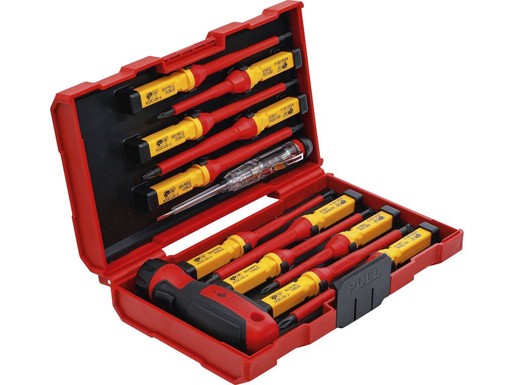 Sada 13 ks izolovaných elektrikářských šroubováků VDE s vyměnitelnými hroty je určena pro práce na elektrických zařízeních pod napětím i bez něj.
