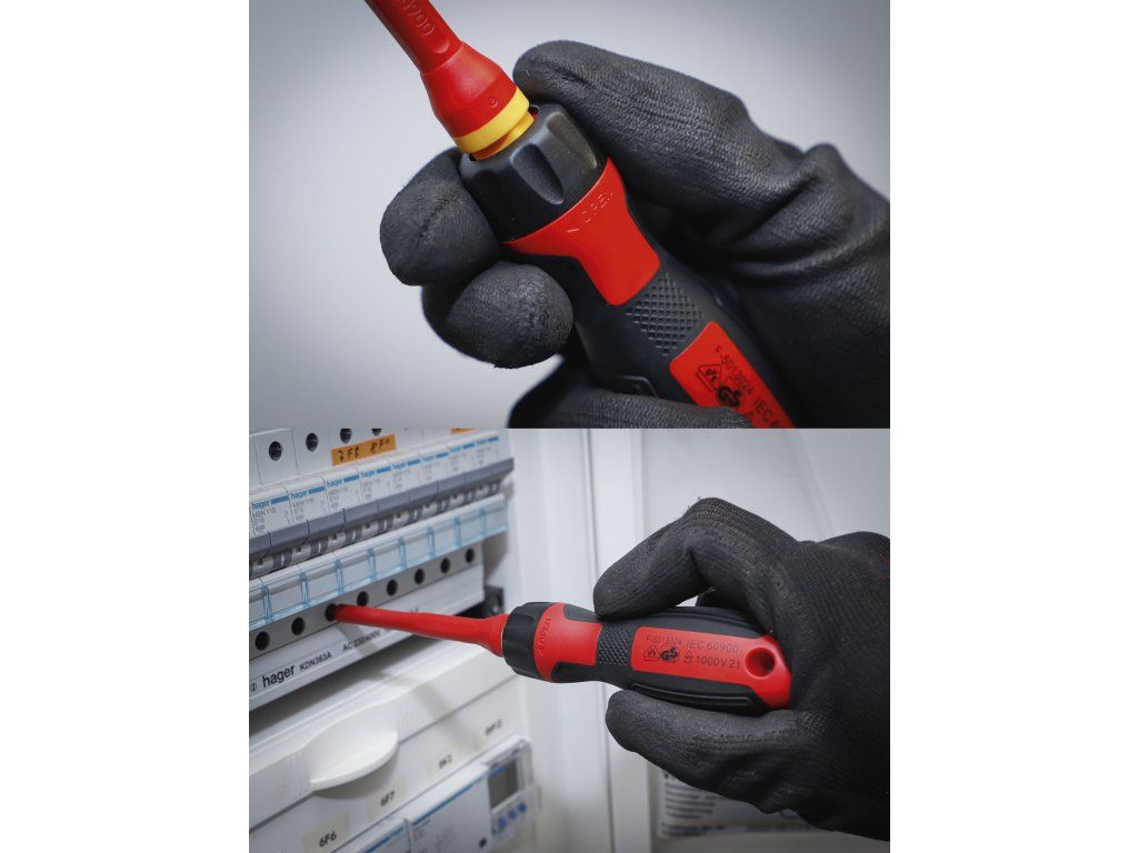 Konstrukce je založena na ergonomické 2složkové rukojeti s bezpečným mechanismem pro výměnné čepele a izolací dle IEC 60900.